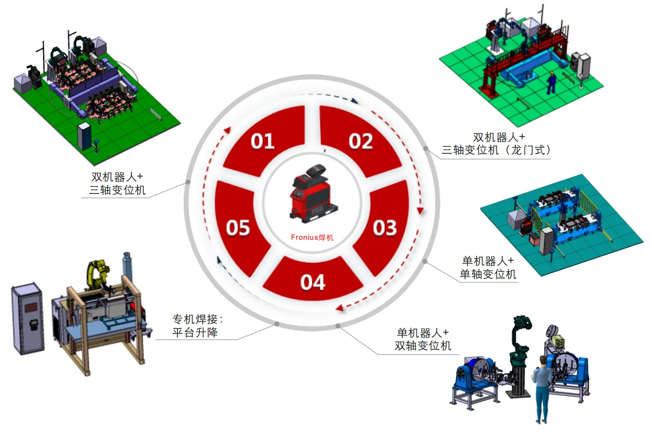 以FRONIUS焊机为核心,集成机器人+变位机+自动化焊接夹具+PLC电控系统,可以满足小于5mm的薄板焊接(变形量小,成型好),又能满足5-30mm的中厚板焊接(焊接时不用预热、不用开剖口的情况下,依旧可以保证产品的熔深≥1.2mm,且焊缝成型好,气孔率低)。